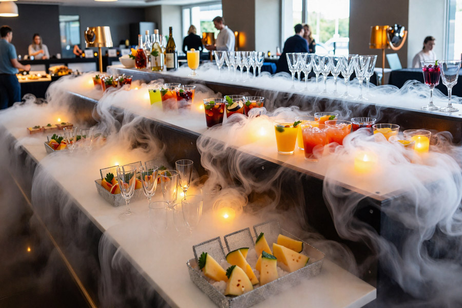 Лёд сохраняет румяность рыбы/мяса + эффект тумана.